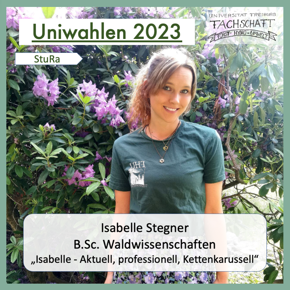 Hey, ich bin Isabelle, 26, 4. Semester Waldwissenschaften mit Nebenfach nachhaltige Landnutzung im internationalen Kontext. Bin seit Beginn meines Studiums in der Fachschaft aktiv und kümmere mich hauptsächlich um den AK Social media und den Mailverkehr. Ich interessiere mich generell für alle Arten des Engagements auf verschiedenen Ebenen und will mich zukünftig auch im Studierendenrat miteinbringen, um dort die Umwelt zu vertreten 🌳