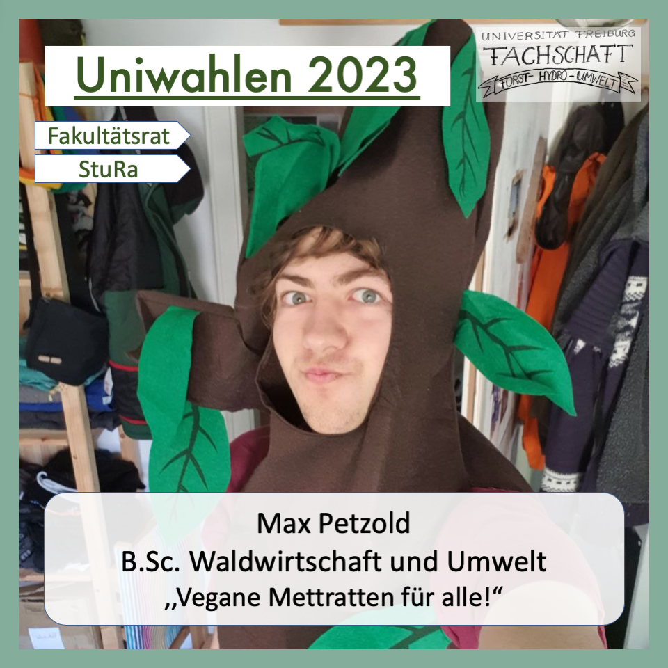 Und an alle die das noch nicht tun: Hi ich bin der Leon (26), studiere mittlerweile im 4. Semester Waldwissenschaften mit Schwerpunkt Umweltsozialwissenschaft. Engagiere mich seit dem ersten Semester in der Fachschaft. Und ja – ich habe Max zu dem Baumkostüm als gute Idee geraten 👍