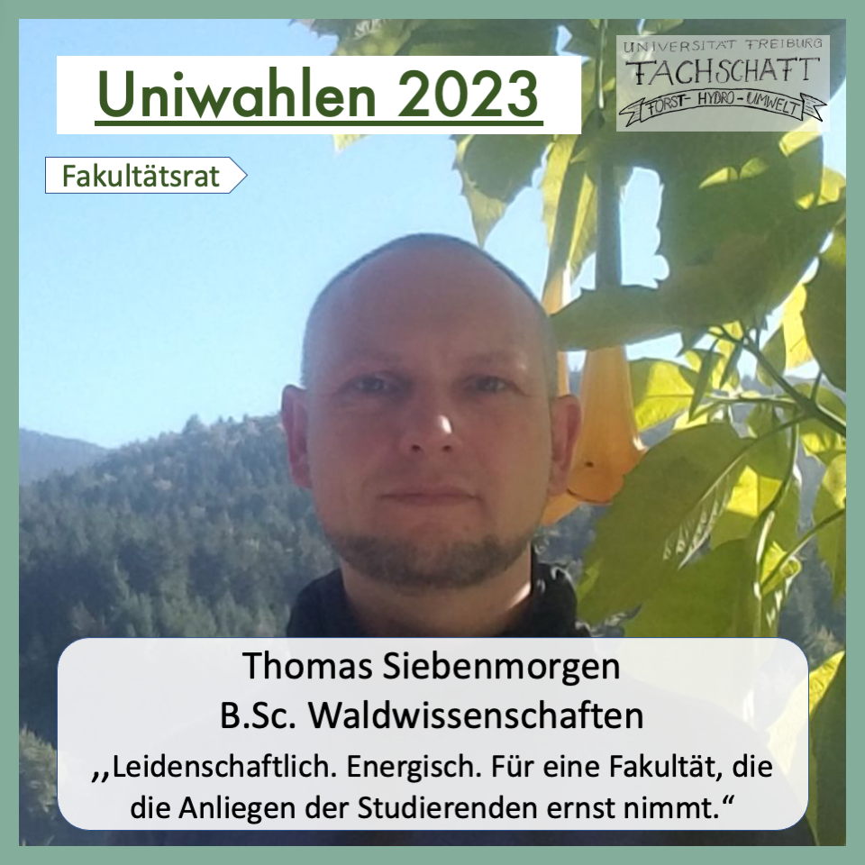 Thomas, 2. Semester Waldwissenschaften. Seit Beginn des 1. Semesters in der Fachschaft und nun bereit um im Fakultätsrat die Studienbedingungen für uns alle zu verbessern.